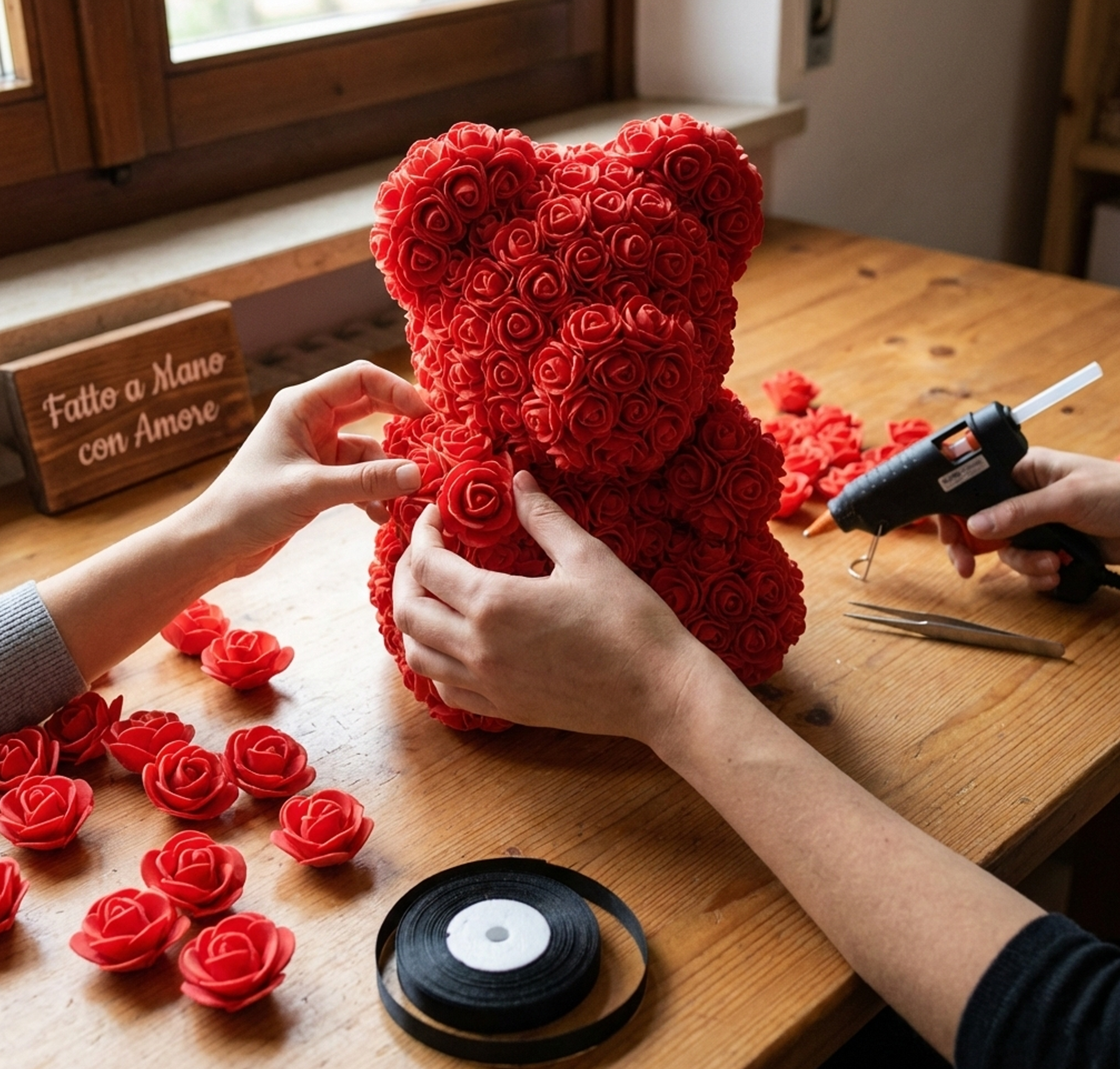 Ogni orsetto è assemblato artigianalmente con oltre 200 rose.