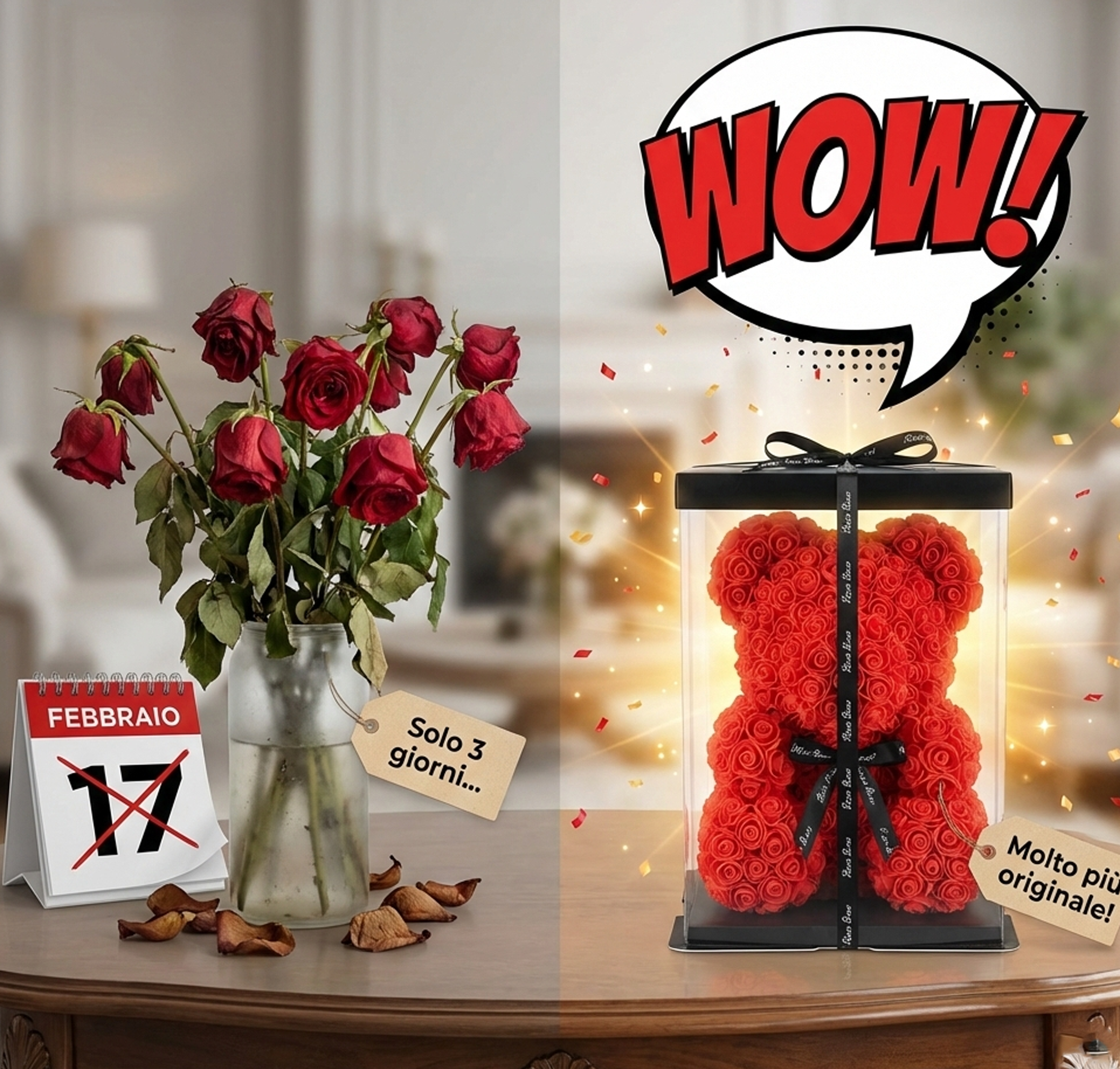Dimentica i regali banali. Il Rose Bear™ non è solo un peluche, è un pezzo d'arredamento elegante che le ricorderà ogni giorno quanto è speciale per te. Arriva pronto per essere regalato